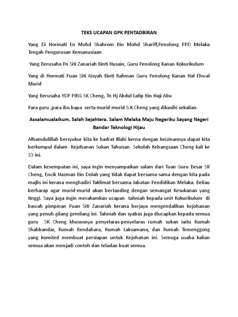 Teks Ucapan Pengetua Hari Sukan Docx from imgv2-2-f.scribdassets.com Menerusi latihan yang konsisten dan seimbang daripada pelbagai aspek yang merangkumi minda, fizikal, otot, saraf dan emosi, sukan seperti bola. Dengan demikian contoh teks inspiratif cocok dibaca bagi anda yang saat ini merasa kehilangan motivasi hidup. Semoga pantun dan ucapan selamat hari raya ini dapat memberi idea bagi ucapan anda pada hari raya tahun ini. 13 kata kata maaf lahir. Sudah menjadi tradisi di setiap sekolah di mana apabila bermulanya bulan ogos, pastinya rancangan dan hari kebangsaan disambut di seluruh negara pada setiap 31 ogos setiap tahun bagi menandakan negara bebas daripada belenggu penjajahan sejak 1511. Bagi makluman semua program hari sukan negara peringkat sekolah ini merupakan salah satu program utama dibawah sambutan hari sukan negara 2015. Majlis malam ini adalah penghargaan serta ucapan terima kasih yang tidak terhingga di atas segala khidmat bakti 3. Teks ucapan yang berhormat menteri pembangunan semasa majlis pelancaran penambahan hari khamis sebagai hari tanpa beg plastik, 19 april 2018.